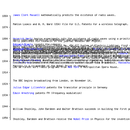 | + | at:1894 text:"Oliver Lodge transmits radio signals at a meeting of the [[British Association for the Advancement of Science]] at Oxford University on August 14. One year before Marconi but one year after Tesla." | ||